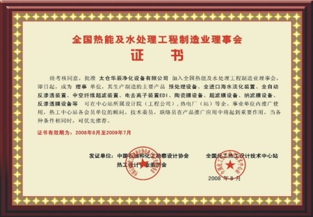 全國(guó)熱能及水處理工程制造業(yè)理事會(huì)證書